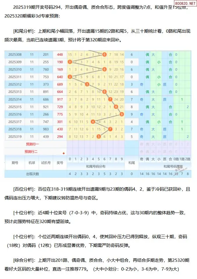 福彩3D第2025320期[玩彩高手]最准最新3d号码预测