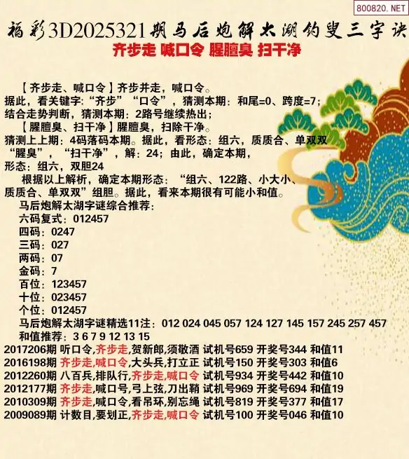25年321期马后炮解太湖字谜之-齐步走 喊口令 腥膻臭 扫干净