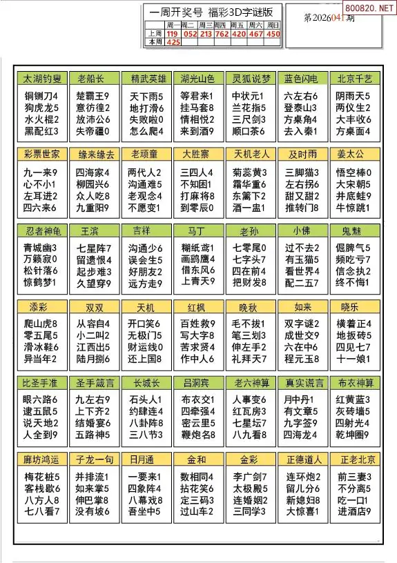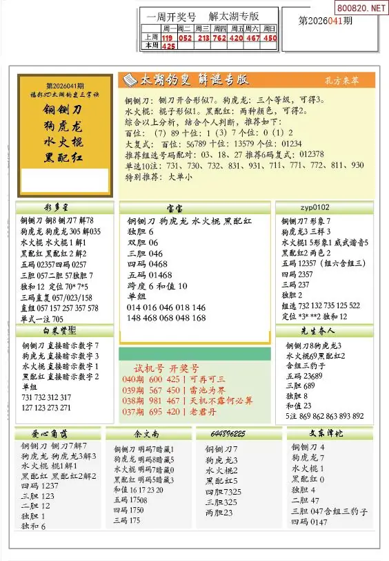 26年041期解太湖3d字图迷汇总彩报