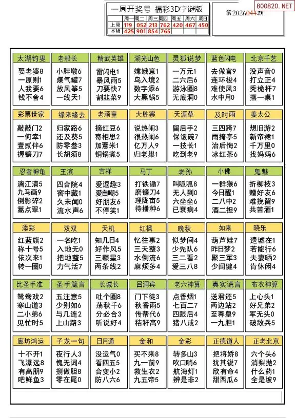 26年044期解太湖3d字图迷汇总彩报