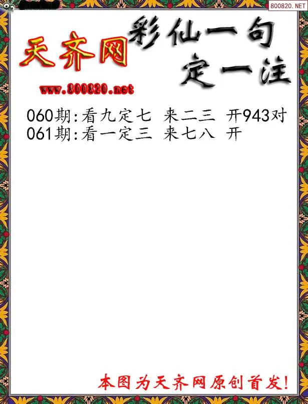 061期彩仙一句定三码3D字图谜