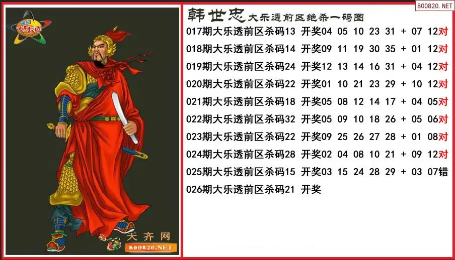 韩世忠2026026期大乐透前区绝杀一码图-原创