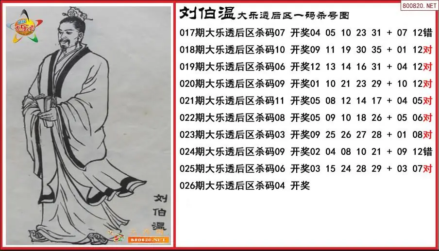 刘伯温2026026期大乐透后区一码杀号图-原创
