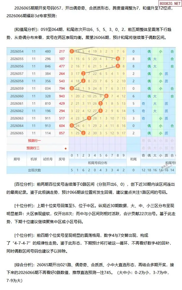 福彩3D第2026066期[玩彩高手]最准最新3d号码预测