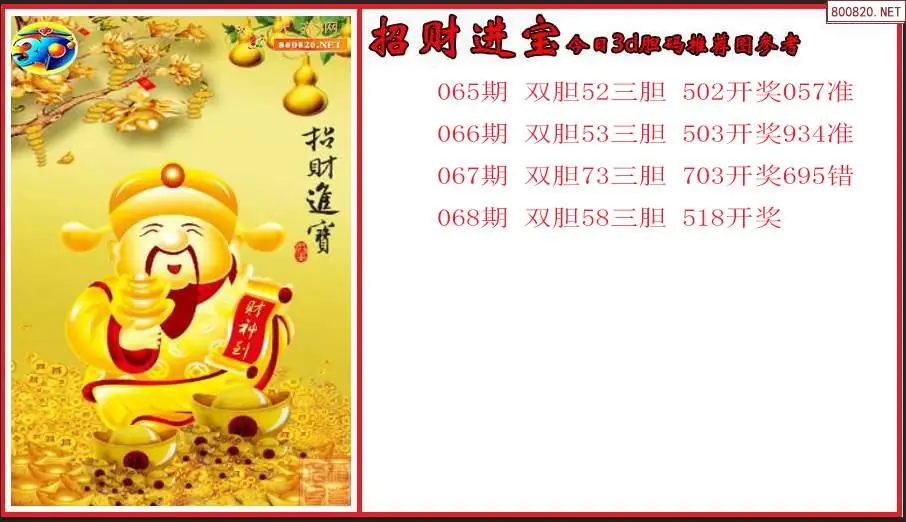 招财进宝2026068期今日3d胆码推荐图参考(原创)
