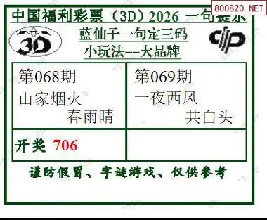 2026069期蓝仙子一句定三码3d图谜