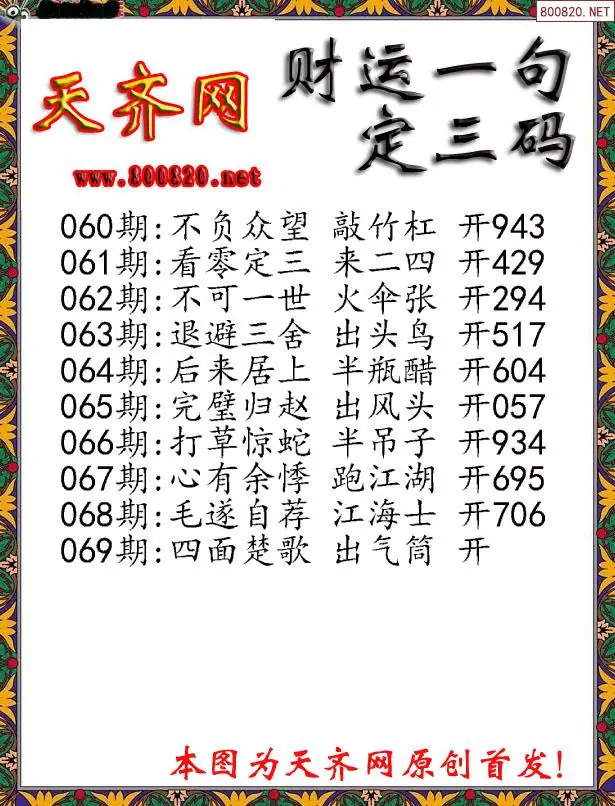 069期财运3D一句定三码字图谜