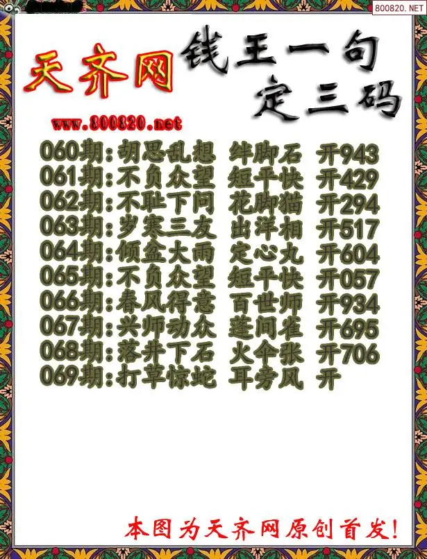 069期钱王3D一句定三码字图谜