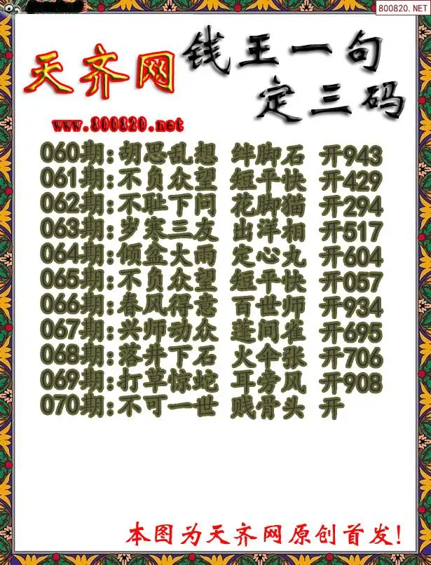 070期钱王3D一句定三码字图谜