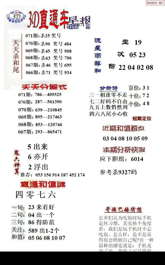 26年071期福彩3D直通车早报ABCD版