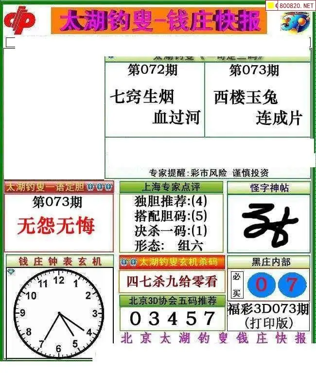 钱庄报26073期钱庄快报一句定三码图谜