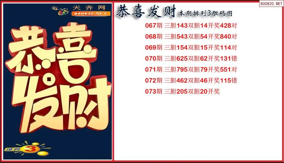 恭喜发财2026073期本期排列3胆码图(原创)