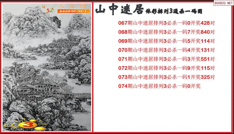 2026074期山中迷居体彩排列3通杀一码图(原创)