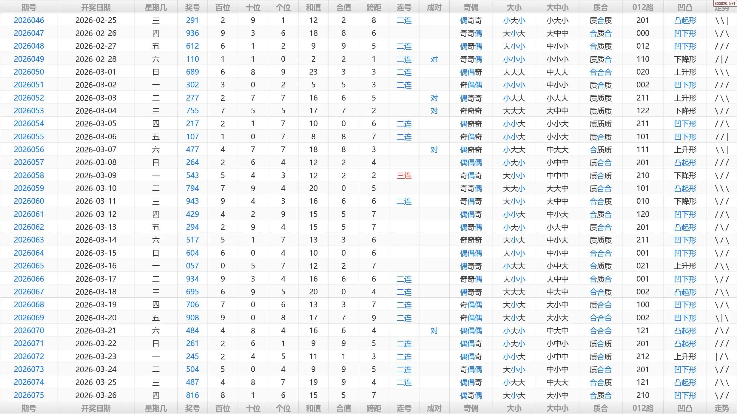 076期福彩3D历史开奖号码统计表