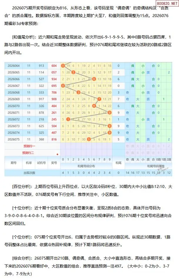 福彩3D第2026076期[玩彩高手]最准最新3d号码预测