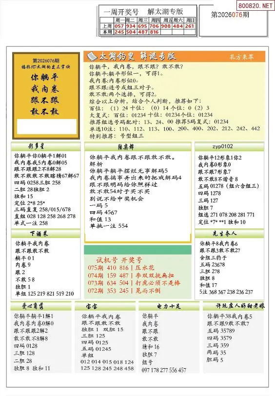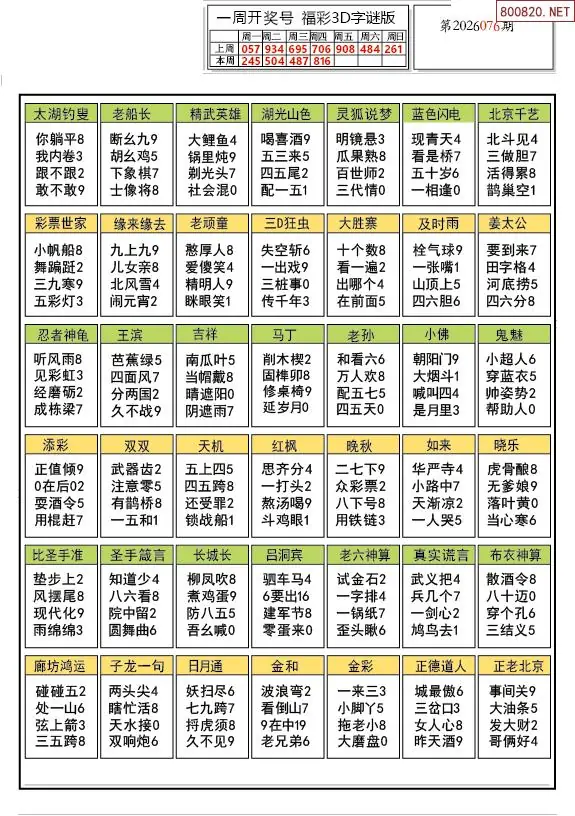 26年076期解太湖3d字图迷汇总彩报