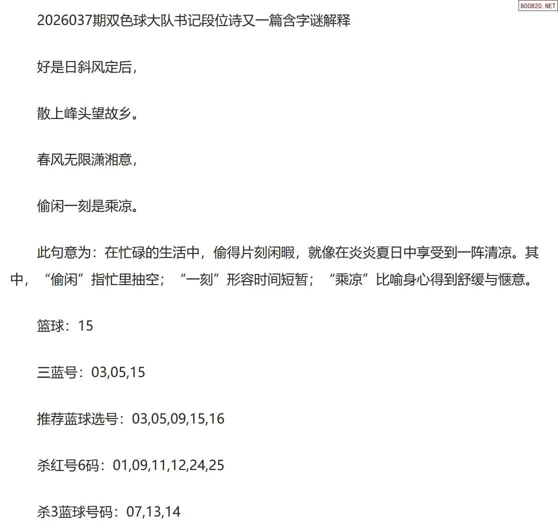 8 双色球26037期牛彩字谜诗迷汇总(天