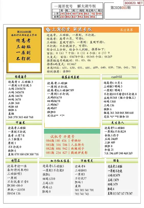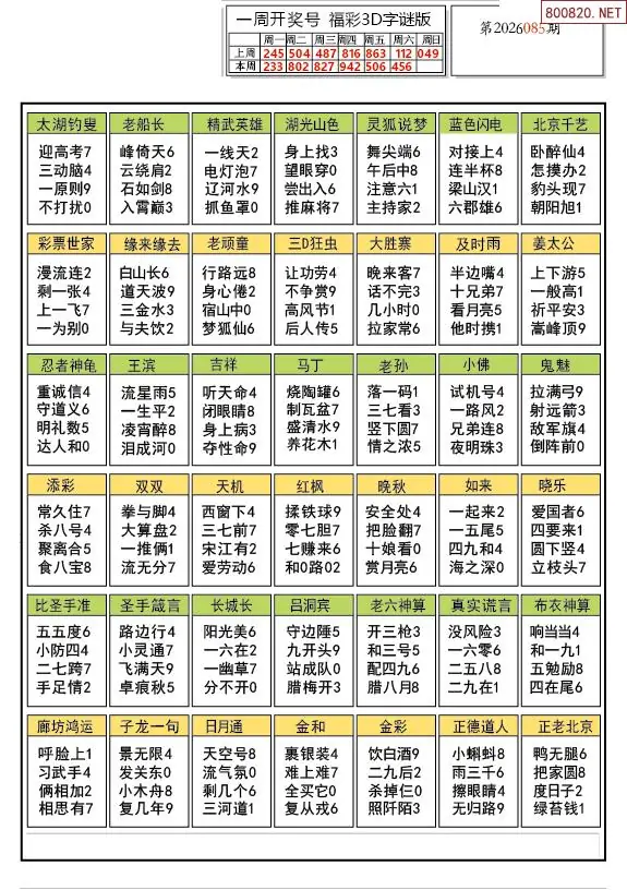 26年085期解太湖3d字图迷汇总彩报