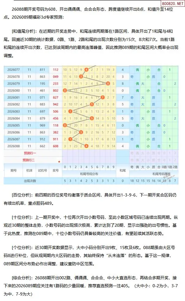 福彩3D第2026089期[玩彩高手]最准最新3d号码预测