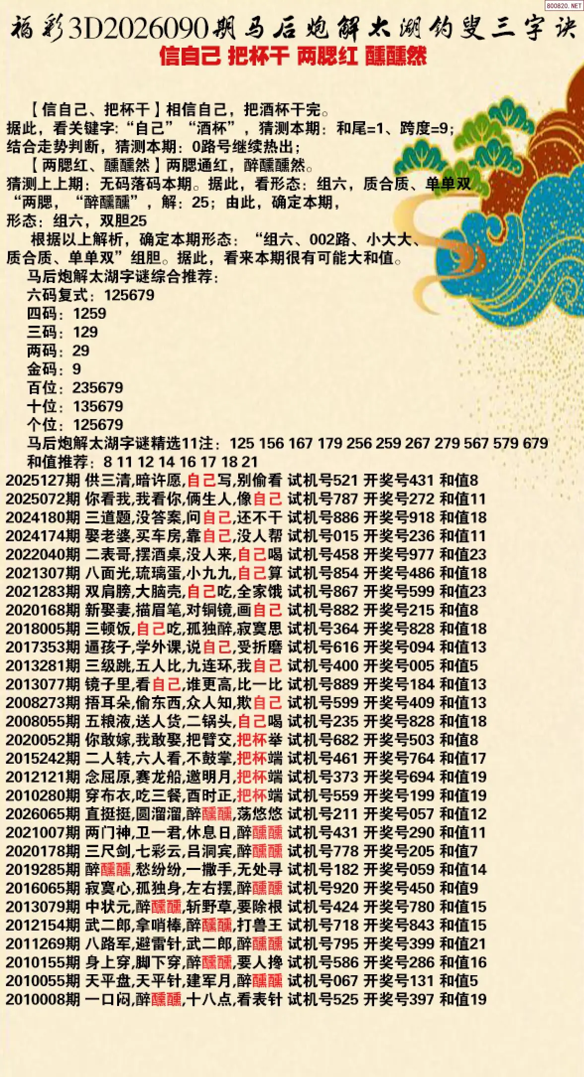 26年090期马后炮解太湖字谜之-信自己 把杯干 两腮红 醺醺然