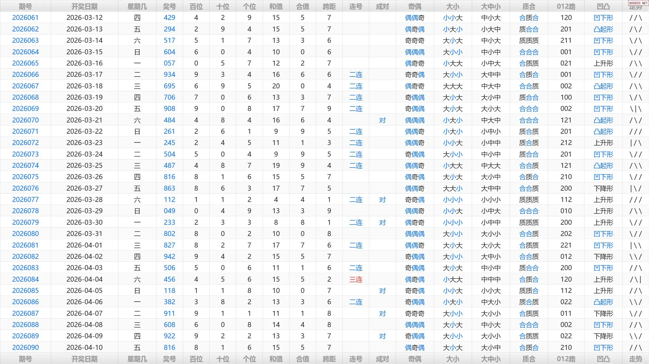 091期福彩3D历史开奖号码统计表