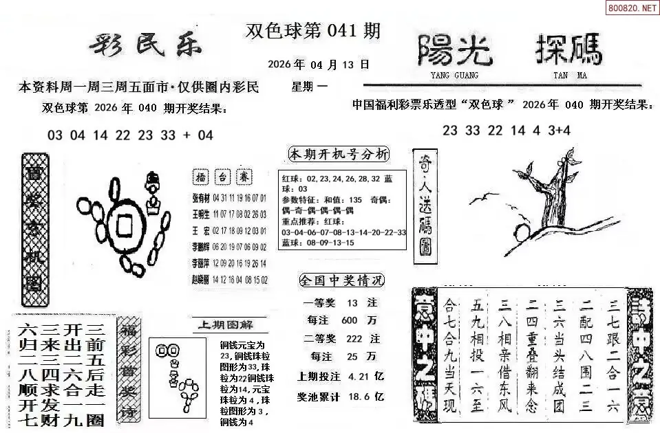 20 26年041期双色球飘零一句定凤尾
