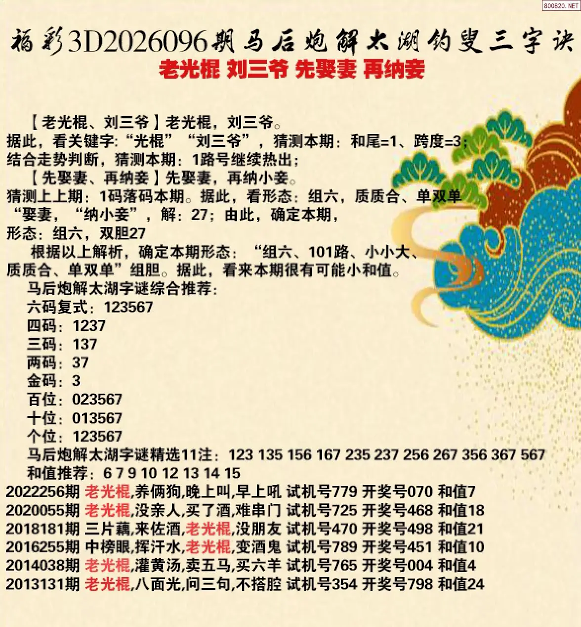 26年096期马后炮解太湖字谜之-老光棍 刘三爷 先娶妻 再纳妾