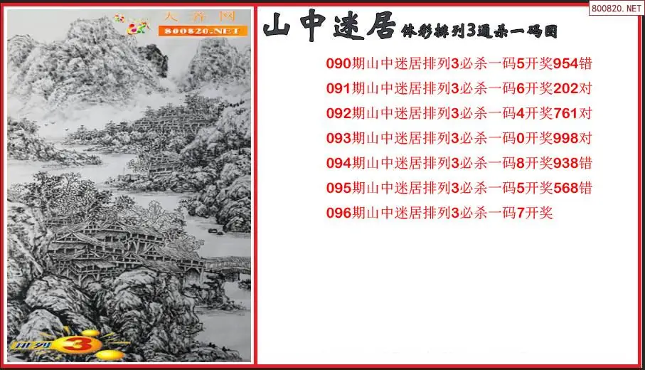 2026096期山中迷居体彩排列3通杀一码图(原创)