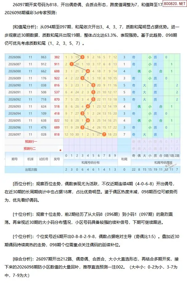 福彩3D第2026098期[玩彩高手]最准最新3d号码预测