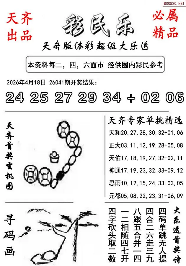4 26年042期天齐版大乐透彩民乐图谜