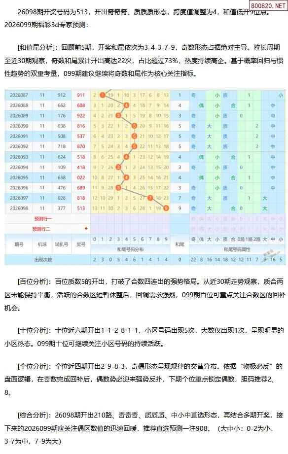 福彩3D第2026099期[玩彩高手]最准最新3d号码预测