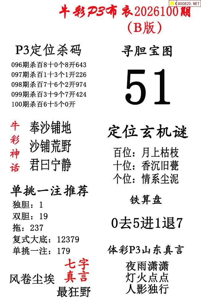牛彩体彩P3布衣2026年100期AB版图谜(精华版)