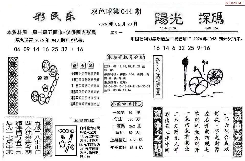 20 26年044期双色球飘零一句定凤尾