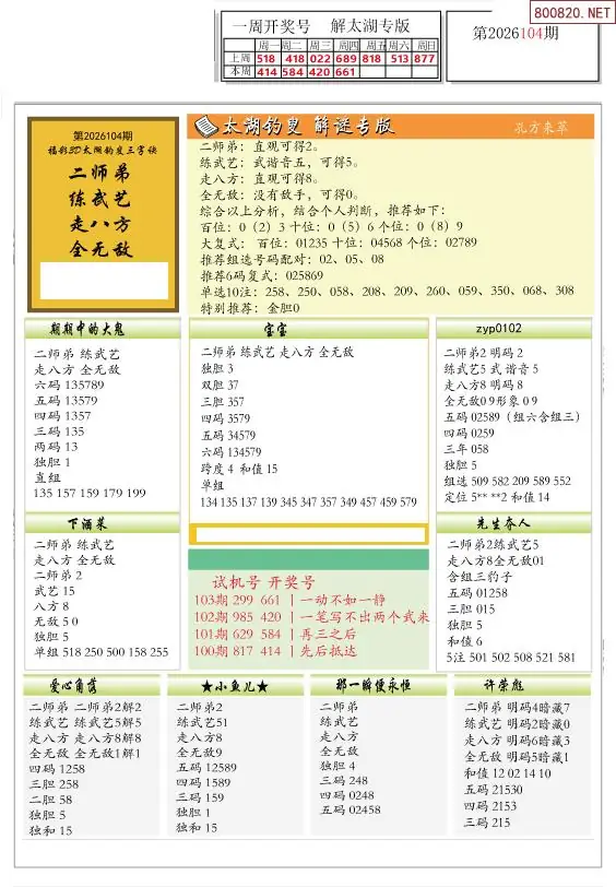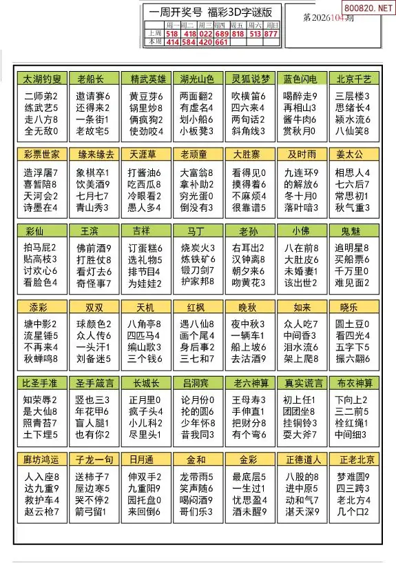 26年104期解太湖3d字图迷汇总彩报