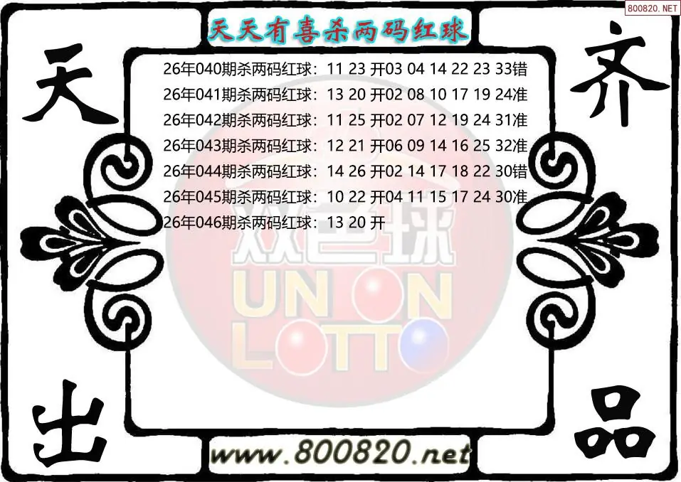 天天有喜26年046期杀双色球红球图迷