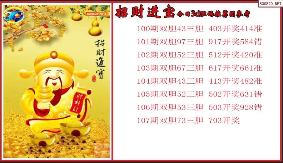 招财进宝2026107期今日3d胆码推荐图参考(原创)