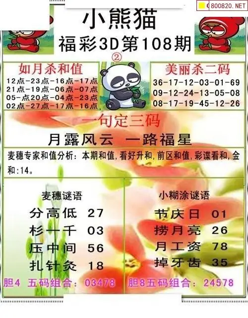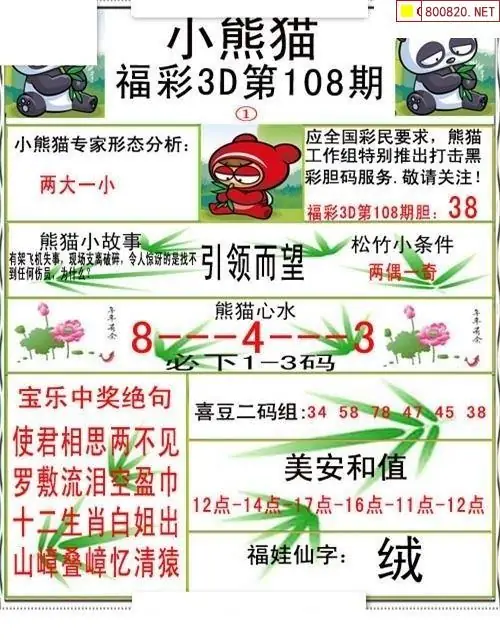 小熊猫26108期美安和值+一句定三码3d图谜