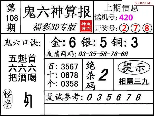 鬼六图26108期鬼六神算报+鬼六胆码图迷
