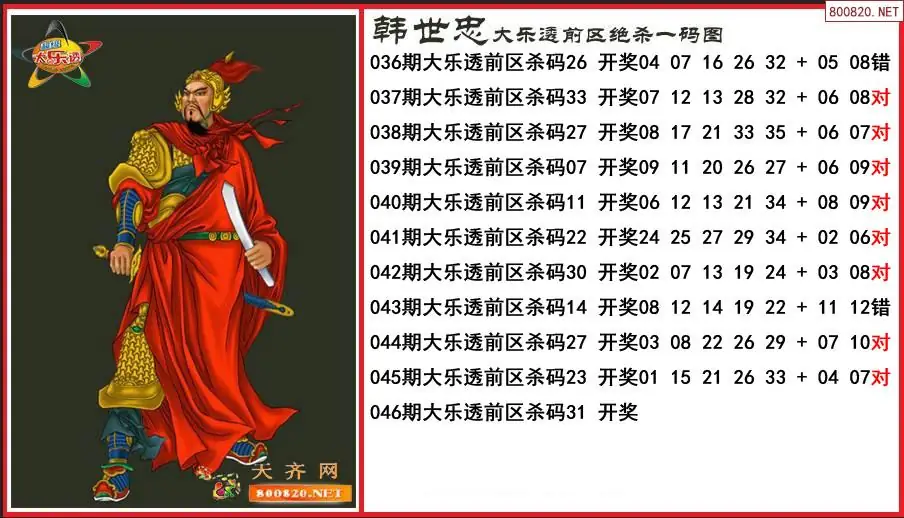 韩世忠2026046期大乐透前区绝杀一码图-原创