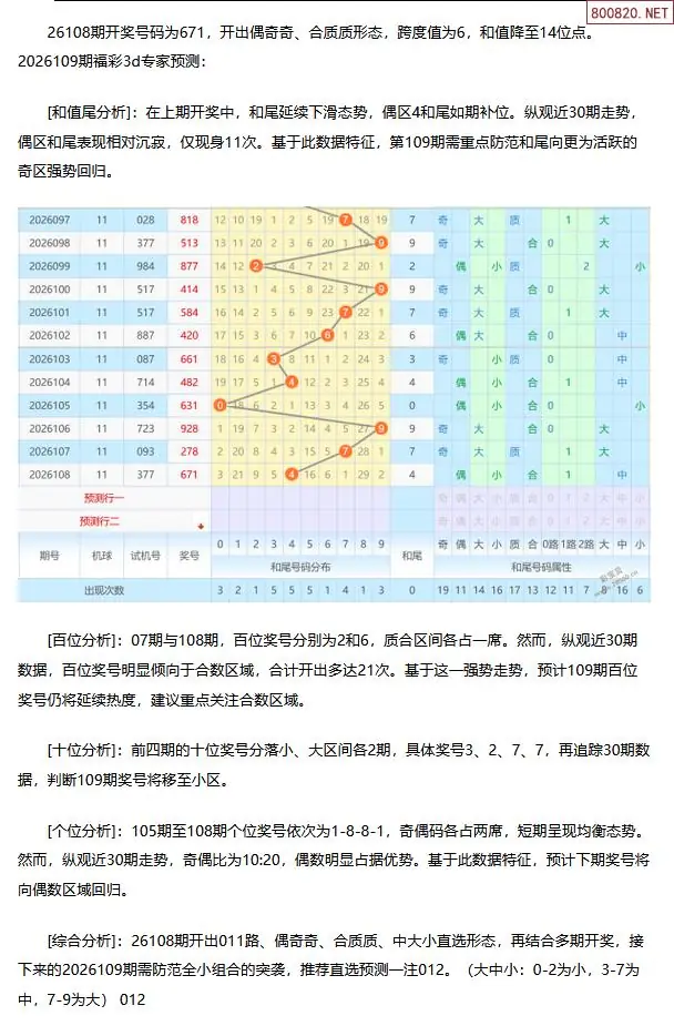 福彩3D第2026109期[玩彩高手]最准最新3d号码预测