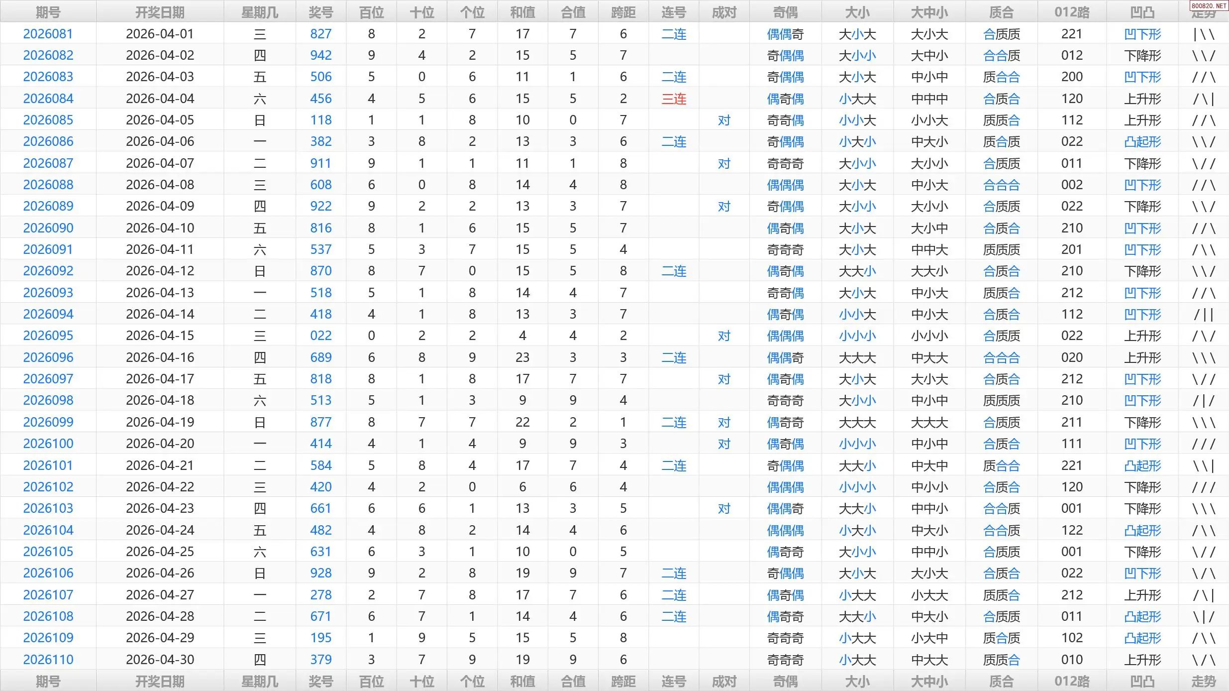 111期福彩3D历史开奖号码统计表